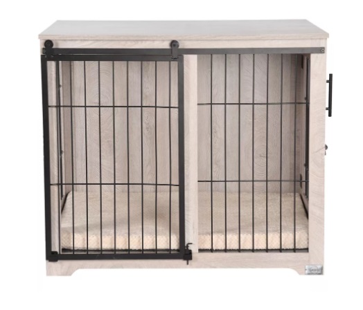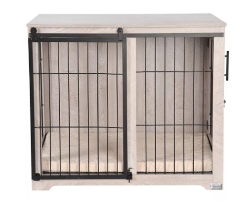 De behuizing is gemaakt van duurzaam hout met een fineerlaag, gecombineerd met stevig metalen traliewerk voor ventilatie en zicht. De bench is voorzien van zowel een schuifdeur aan de voorkant als een scharnierende zijdeur voor flexibele toegang. Binnenin ligt een zacht matras met afritsbare hoes. Onder het matras bevindt zich een kunststof opvangbak die eenvoudig te reinigen is.